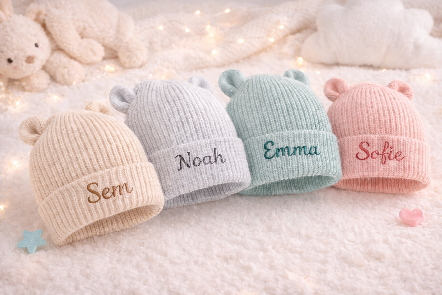 Zachte baby beanie met oortjes, gemaakt van biologisch katoen en te personaliseren met naam.
