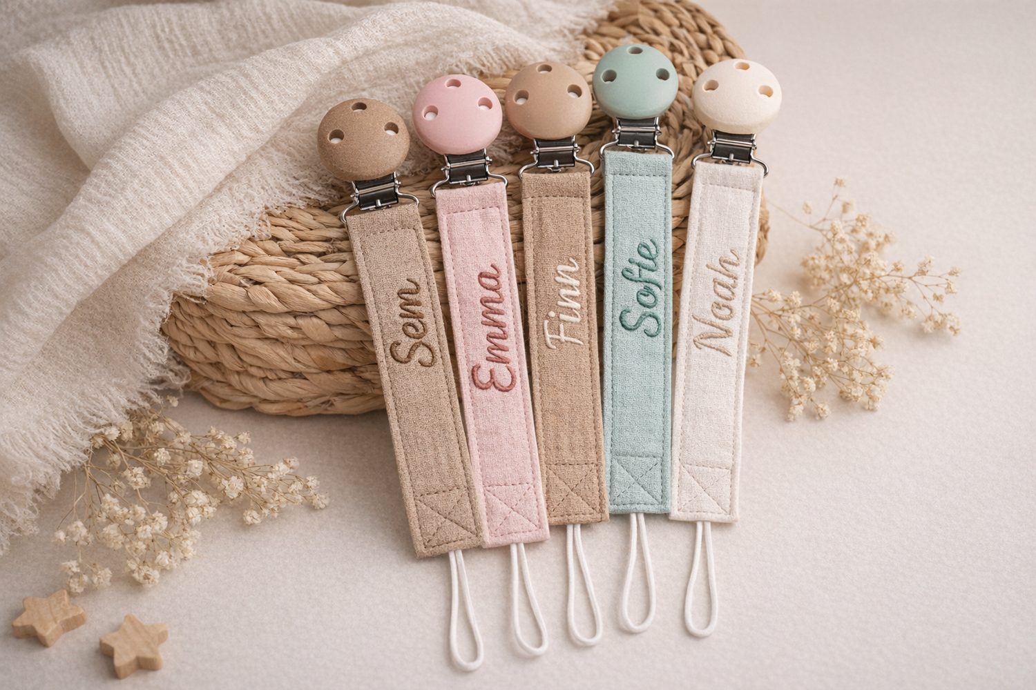 Gepersonaliseerde speenkoordjes met liefde geborduurd